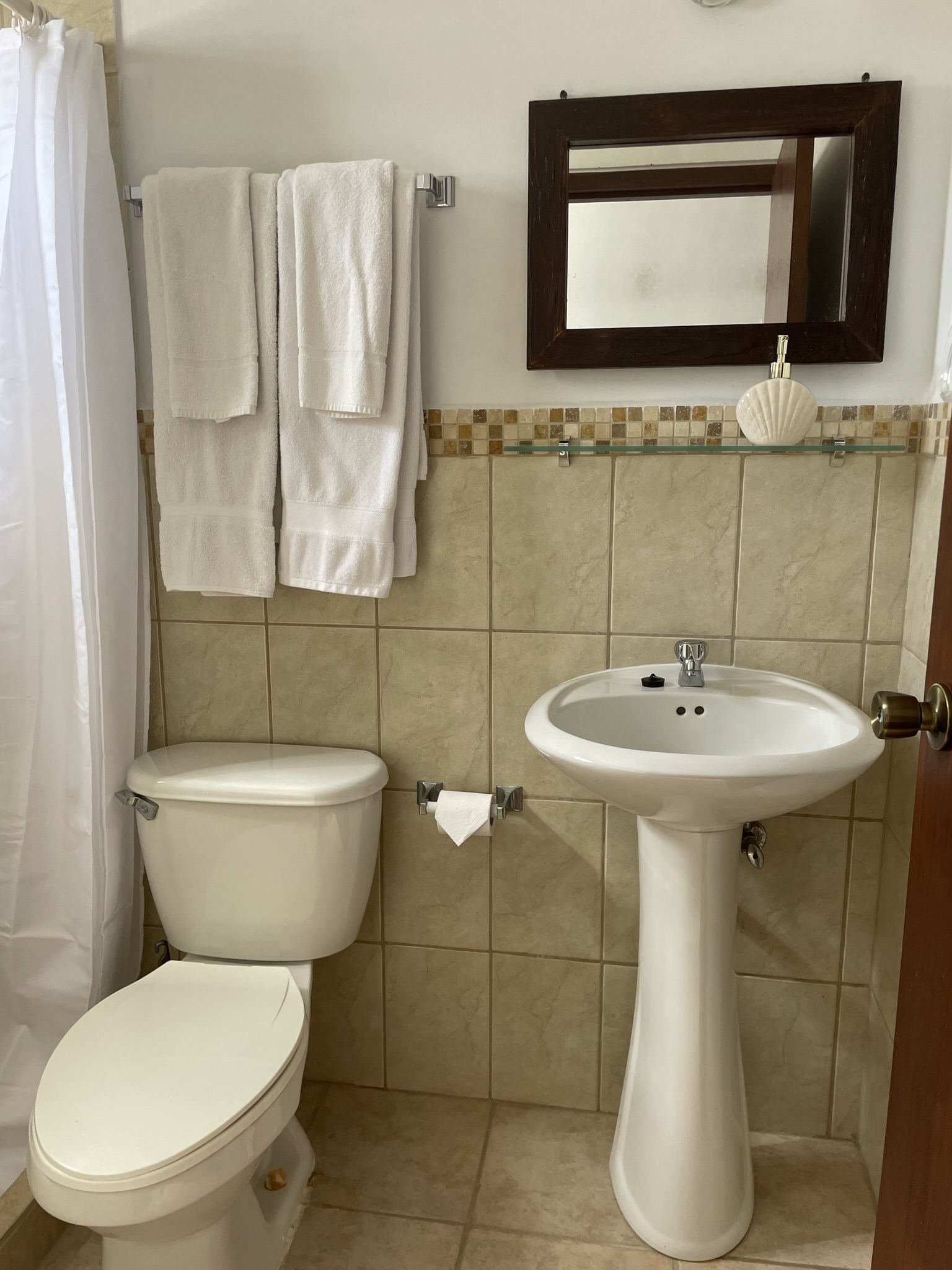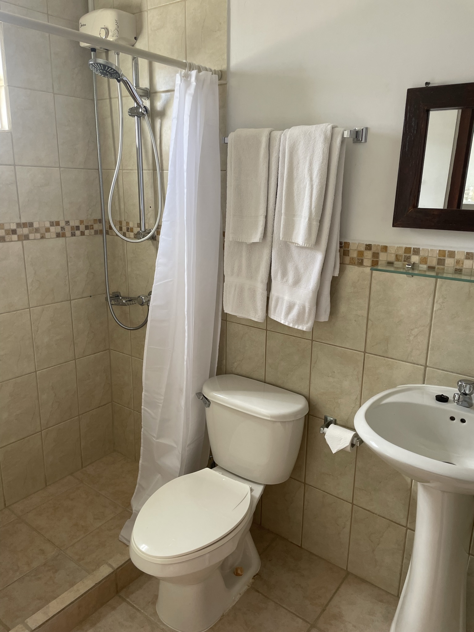 The bathroom features a comfortable shower with water heater, sink and toilet.