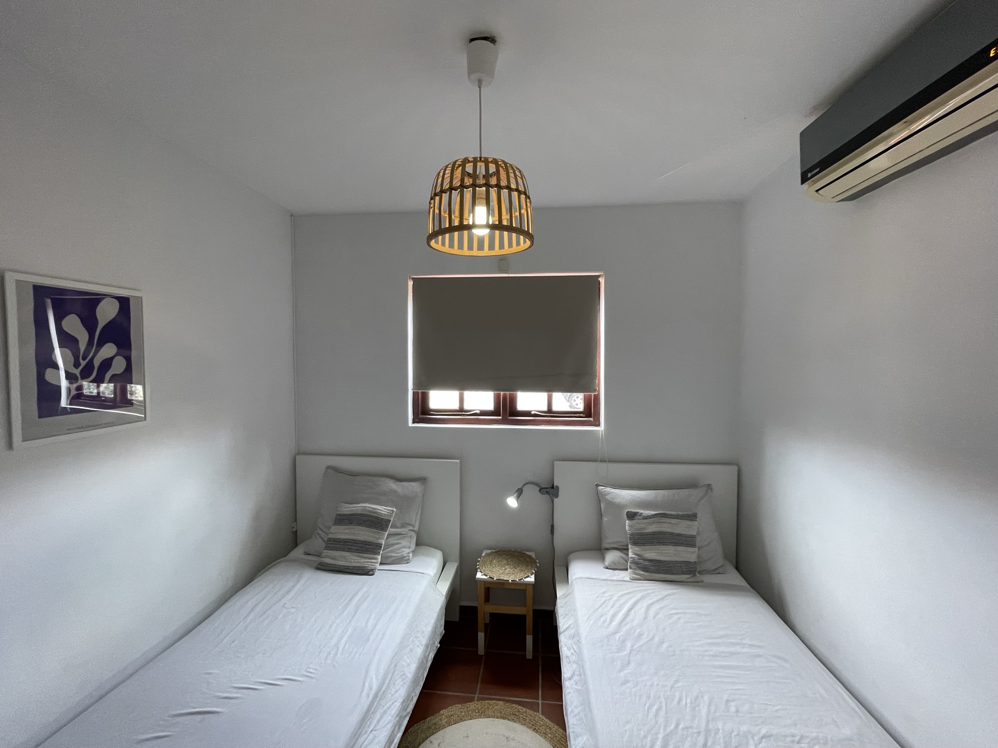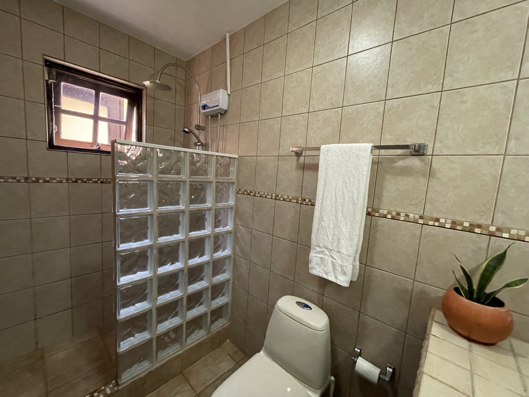 The master bedroom features a queen-size bed, a walk-in closet, and an ensuite bathroom with a rain shower, sink, and toilet. The two additional bedrooms—one with a double bed, the other with two single beds—share a second bathroom, also equipped with a shower, sink, and toilet. Both bathrooms have a water heater for added comfort.