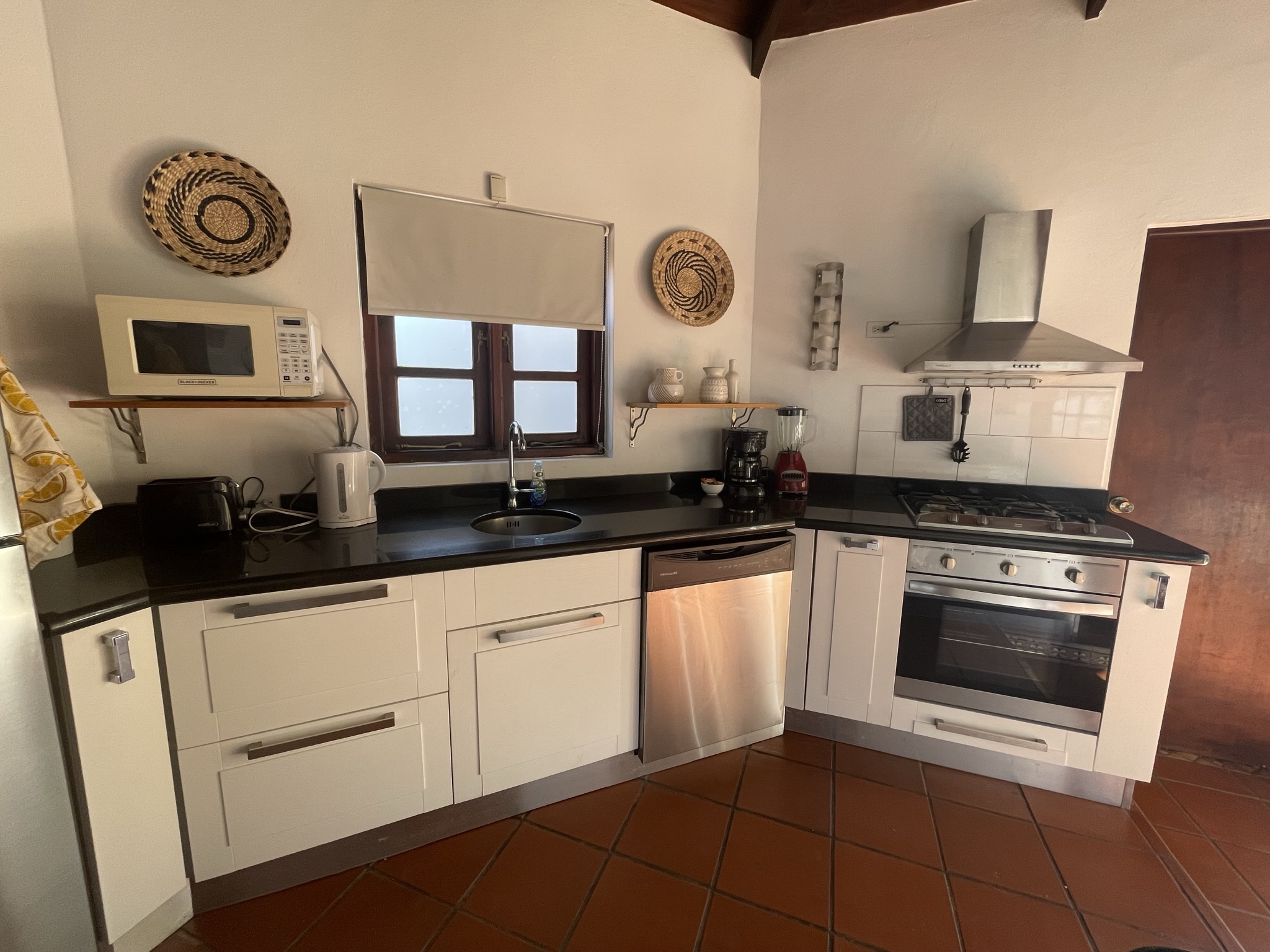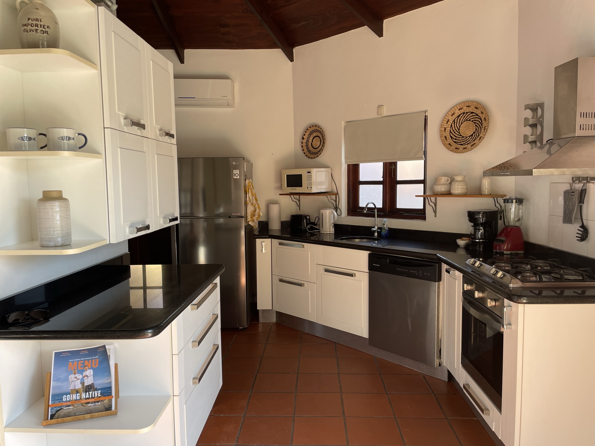 The living room boasts a high wooden ceiling, creating an airy and inviting atmosphere. Relax on the cozy couch or rocking chair, watch your favorite shows on the flatscreen TV, or gather around the dining table for a home-cooked meal. The fully equipped kitchen includes a 4-burner cooktop, oven, microwave, dishwasher, and large fridge, making meal preparation a breeze.